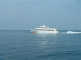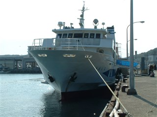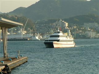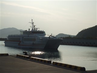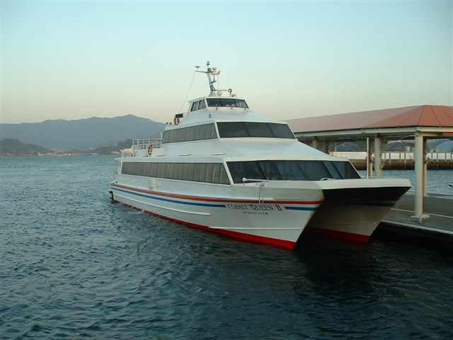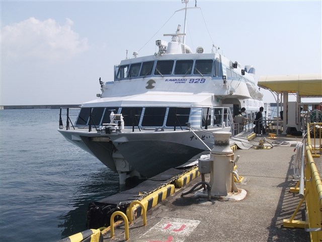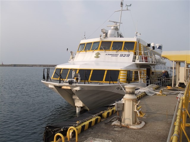 ![]() | ![]() ![]() | 形式は同じですが、行きとは色が違うジェットフォイルです。 海は凪いでいて、穏やかな航海でした。 | |