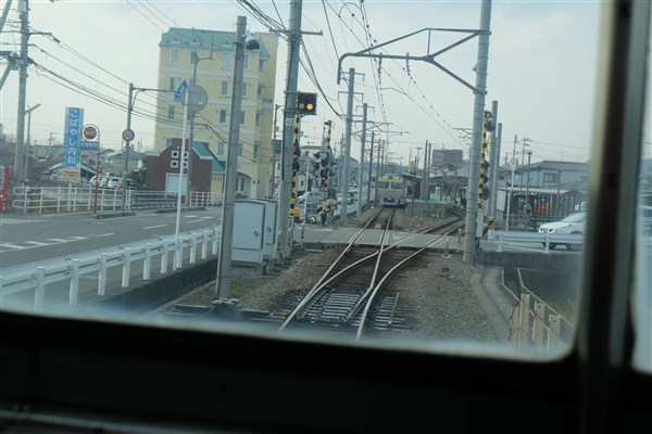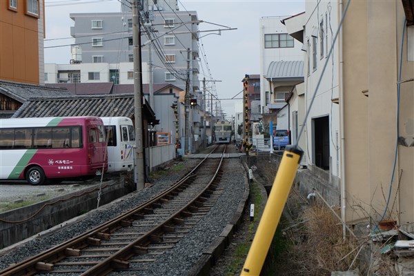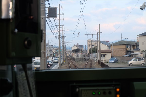 | トップバッターの横河原行き | 住宅街の間を進みます。 | |