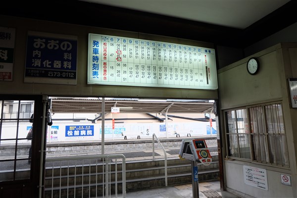 | 松前駅の改札口。電車の本数は多いです。 | 松山市駅行きが接近 | |