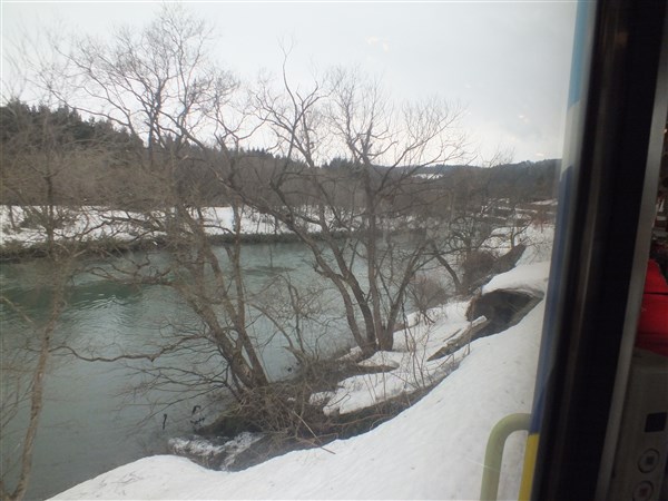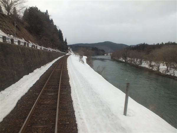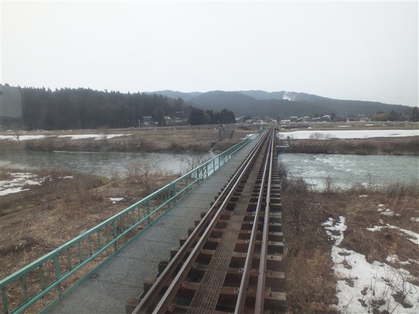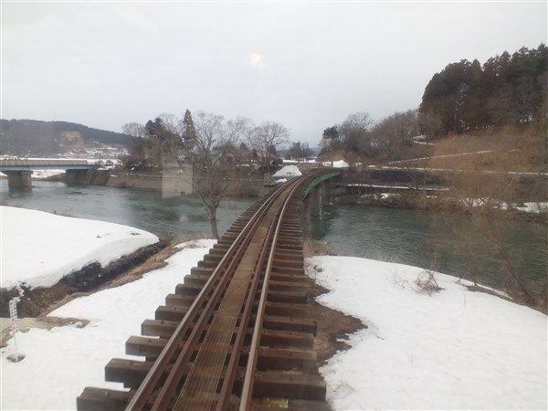 | 16時18分、西滝沢駅を発車 | カーブをしながら子吉川を渡ります。 | |