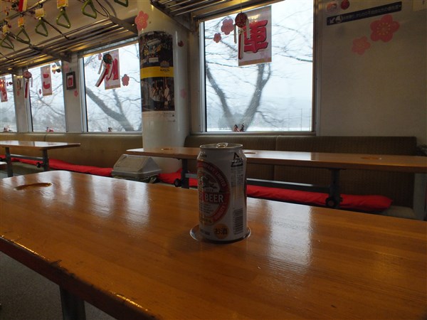 | 復路は羽後本荘駅近くで仕入れたビールを飲みながら | 17時06分、再び前郷駅で列車交換 | |